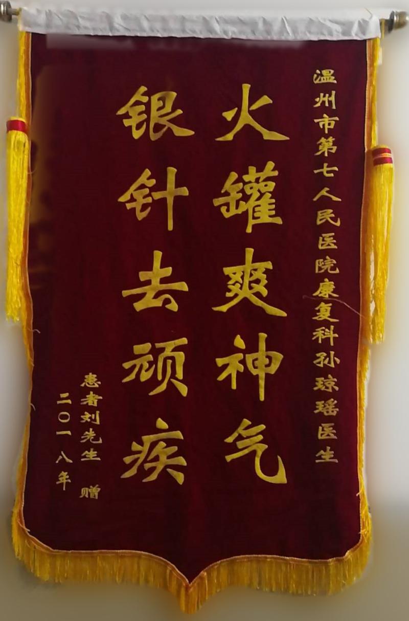 ??? 近日,康復(fù)科孫瓊瑤醫(yī)生收到出院患者劉先生送來的一份珍貴禮物——錦旗。鮮紅的錦旗上,“銀針去頑疾,火罐爽神氣”十個金色大字熠熠生輝,映襯著劉先生臉上的笑容更加燦爛?;颊邉⑾壬哉Z誠懇,感情真摯地表達(dá)了對孫瓊瑤醫(yī)生醫(yī)德高尚、醫(yī)術(shù)精湛、醫(yī)者仁心的滿懷感激和無盡的感謝之情。同時再三感謝溫州市第七人民全體醫(yī)護(hù)人員在他住院期間對他的精心治療和熱心服務(wù)。